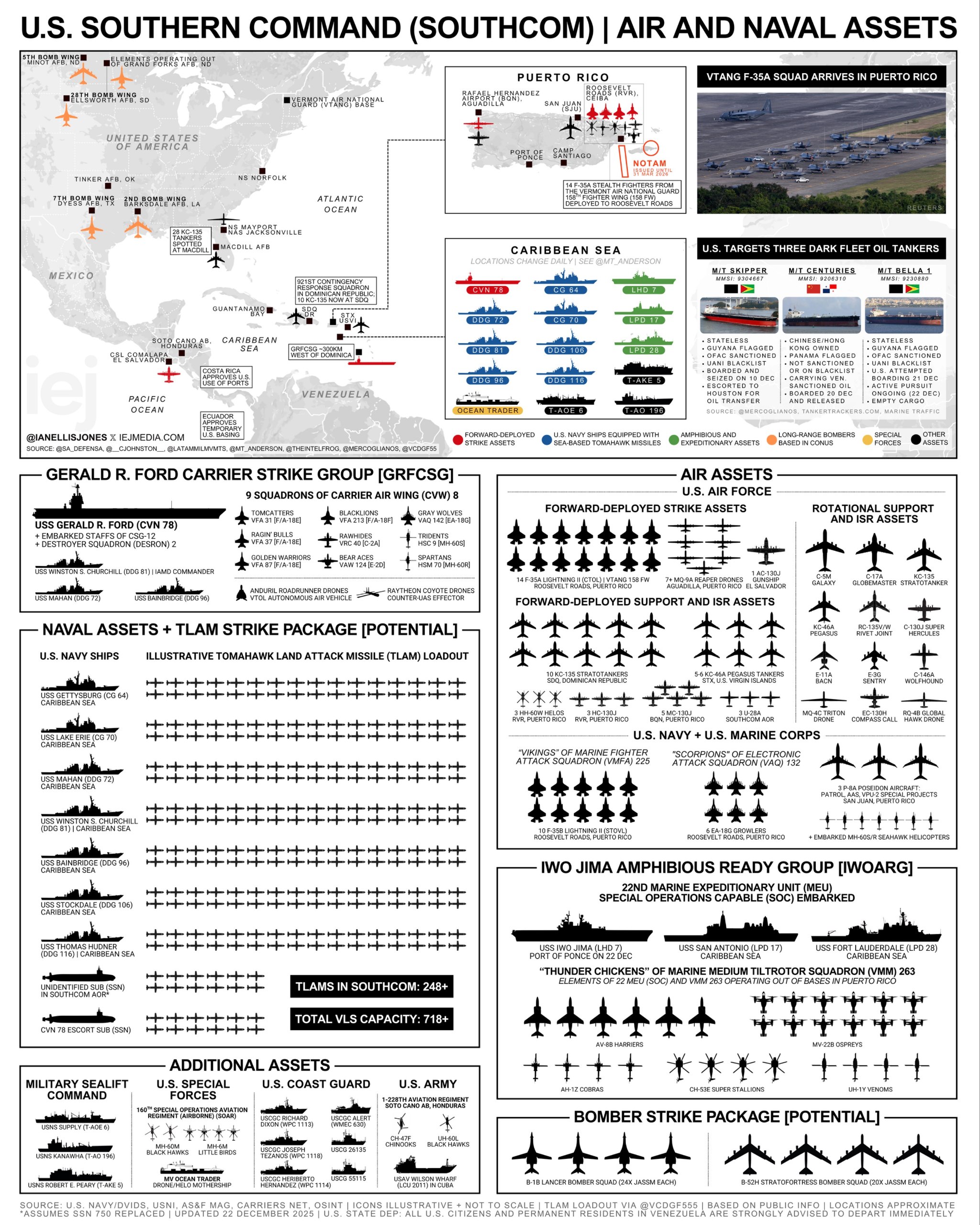 As the United States enforces and expands its blockade, additional military assets have arrived in the Southern Command (SOUTHCOM) region. Fourteen F-35A Lightning II stealth fighters from the Vermont Air National Guard (VTANG) 158th Fighter Wing were deployed to Roosevelt Roads, Puerto Rico, last week. Alongside this deployment, the 921st Contingency Response Squadron is stationed at the Santiago de los Caballeros Airport (SDQ). Additional aircraft in the region include the USAF U-28A Draco, EC-130H Compass Call, and MC-130J.
