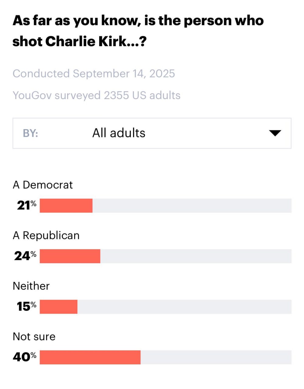 According to a recent YouGov poll, 24% of Americans believe that Tyler Robinson, the shooter who targeted conservative commentator Charlie Kirk, was a Republican. In contrast, 21% of respondents think he was a Democrat. This poll follows a significant media campaign across platforms such as Facebook, Reddit, and X, which has been amplified by figures like Bill Maher and news outlets including Reuters and the New York Times.