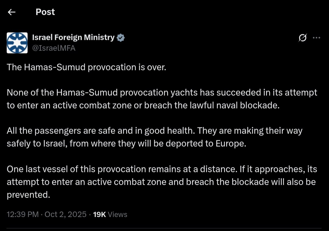 According to the ministry, none of the Hamas-Sumud provocation yachts succeeded in their attempts to enter an active combat zone or breach the lawful naval blockade. All passengers aboard these vessels are reported to be safe and in good health. They are currently making their way to Israel, from where they will be deported to Europe.