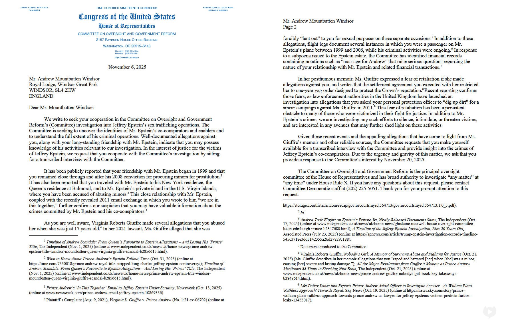 Andrew Mountbatten Windsor, formerly known as Prince Andrew, has been ordered by House Democrats to appear before Congress in Washington, DC. The questioning will focus on his links to convicted pedophile Jeffrey Epstein.