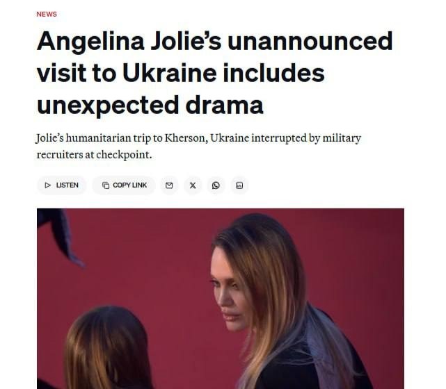 Angelina Jolie entered Ukraine on foot for a humanitarian visit without notifying officials, according to a report by Politico. The visit took place in Kherson, where Jolie"s driver received a military summons at a checkpoint.