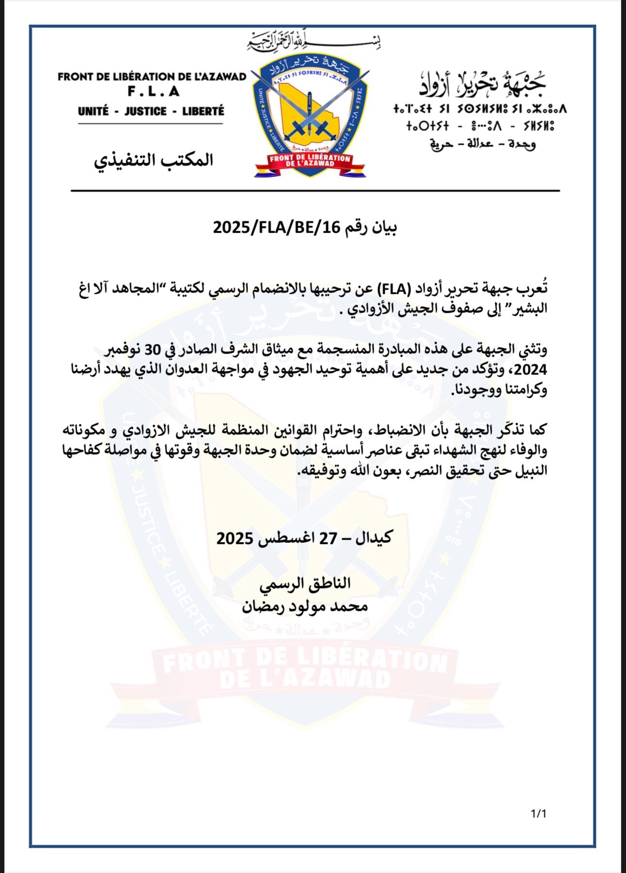 The Azawad Liberation Front (FLA) announced today that the “Mujahid Brother Al-Bashir” battalion has officially joined the ranks of the Azawad Army. This development marks a significant shift in the ongoing conflict in the region, as the FLA seeks to consolidate military strength amid rising tensions.