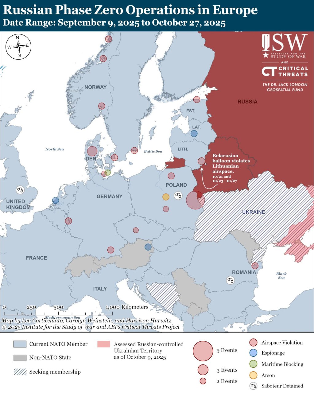 The Institute for the Study of War (ISW) continues to assess that Russia is increasingly engaging in both covert and overt attacks against Europe. Ongoing violations of airspace and non-conventional activities by Russia are considered part of what ISW refers to as "Phase Zero." This phase is characterized as a broader informational and psychological effort to prepare for a potential NATO-Russia conflict in the future.