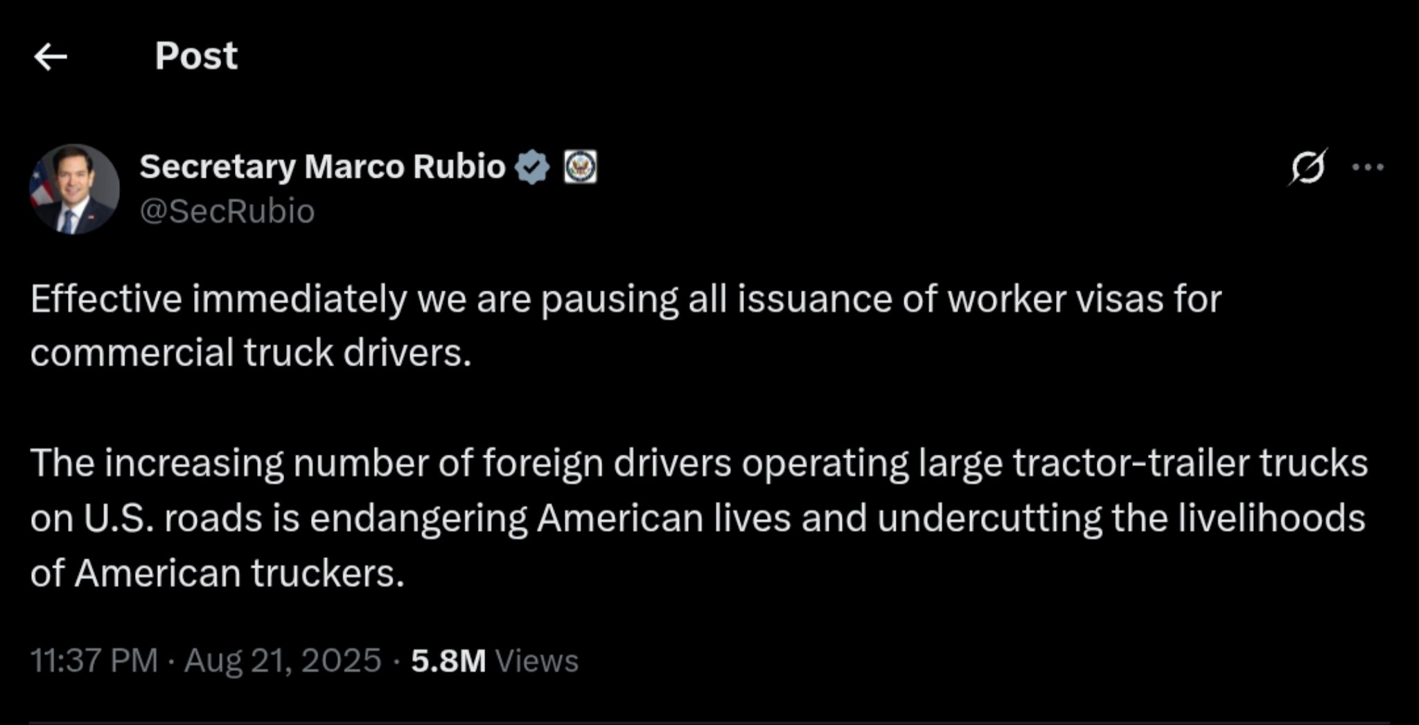 In a significant move, U.S. Secretary of State Marco Rubio announced today an immediate pause on all worker visas for commercial truck drivers, citing urgent risks to American lives and the livelihoods of U.S. truckers. This decision comes amid growing concerns over the increasing number of foreign drivers operating large tractor-trailers on American roads.