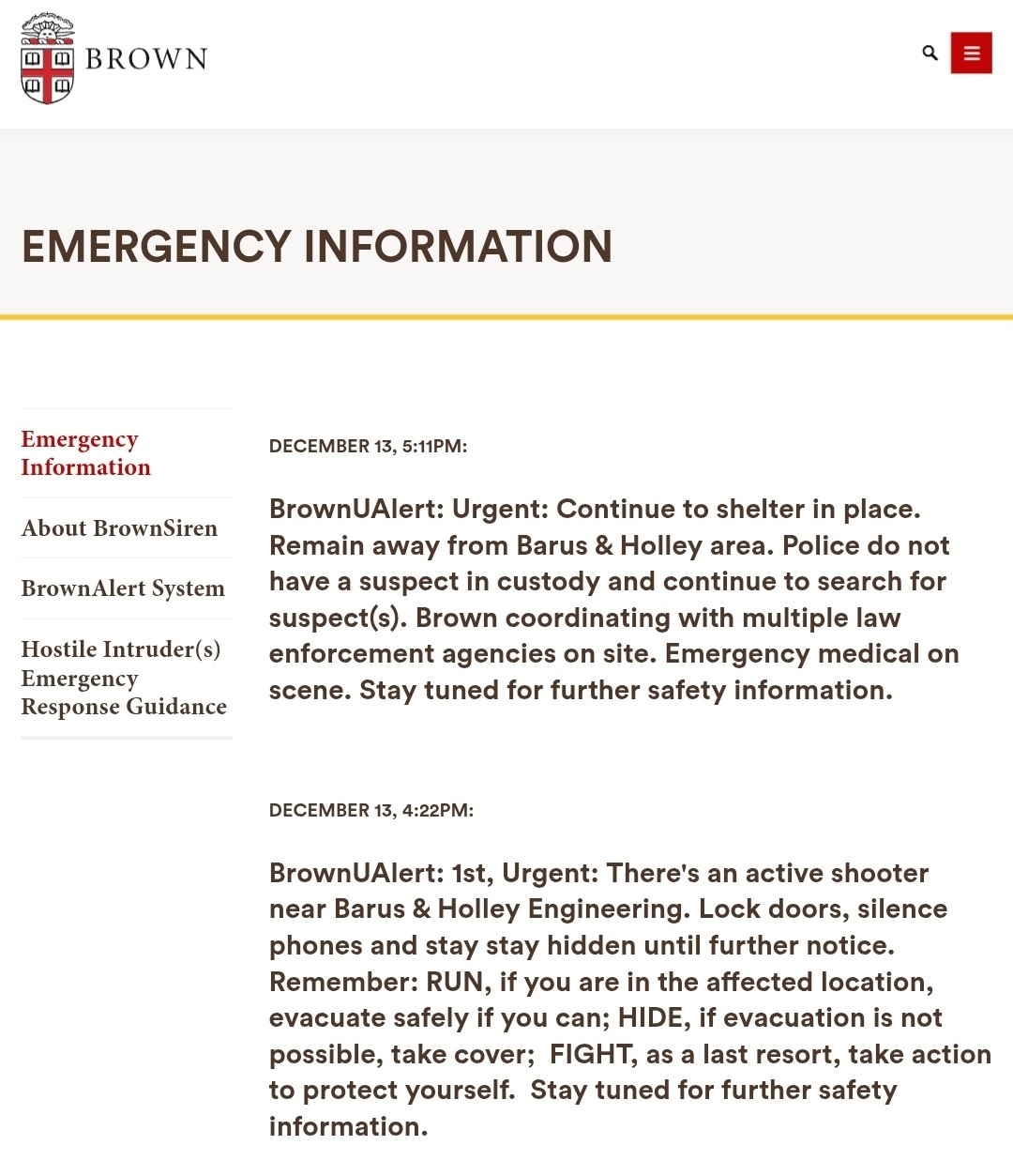 This situation follows recent developments regarding reports of an active shooter at Brown University in Providence, Rhode Island. The university community is urged to stay vigilant and adhere to the shelter-in-place order until further notice.
