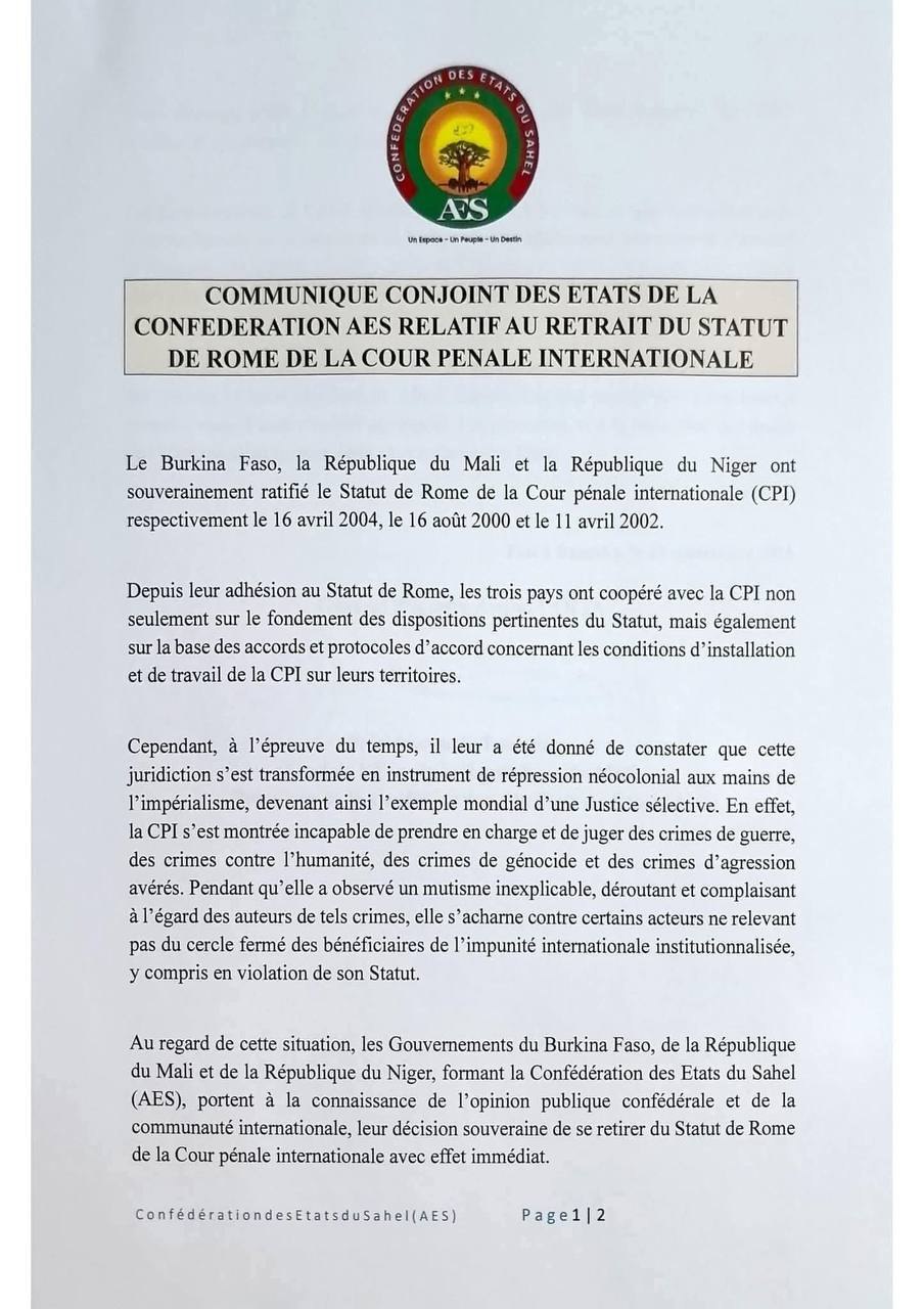 Burkina Faso, Mali, and Niger announced their immediate withdrawal from the International Criminal Court (ICC) on Monday, describing it as a "neo-colonial instrument of oppression in the service of imperialism."