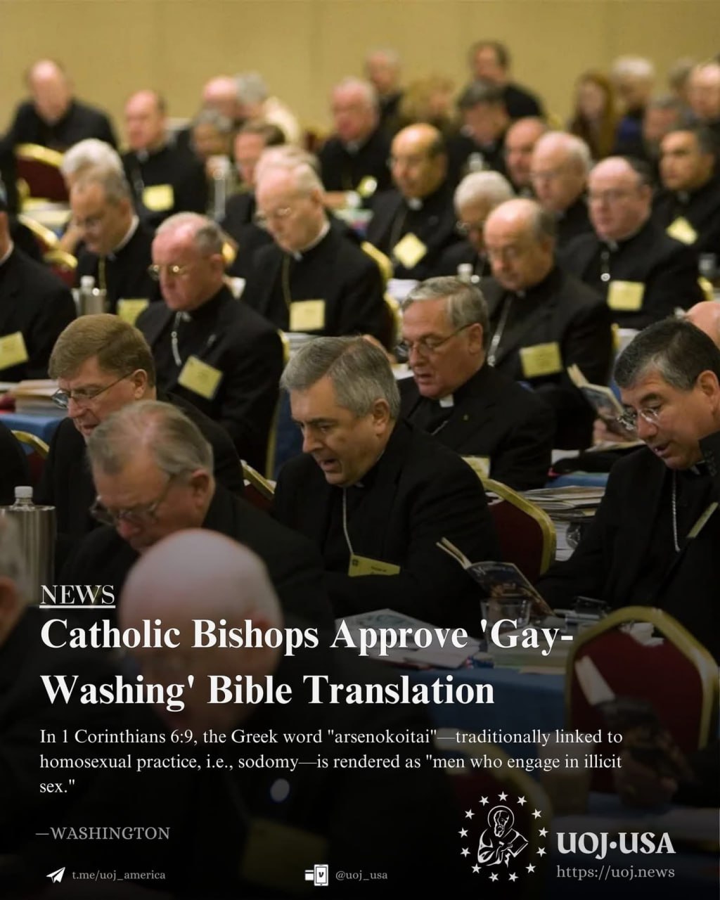 On October 7, 2025, Catholic bishops approved a new Bible translation that alters the meaning of the Greek word "arsenokoitai" found in 1 Corinthians 6:9. Traditionally associated with homosexual practice, the term is now rendered as "men who engage in illicit sex" in the revised translation.