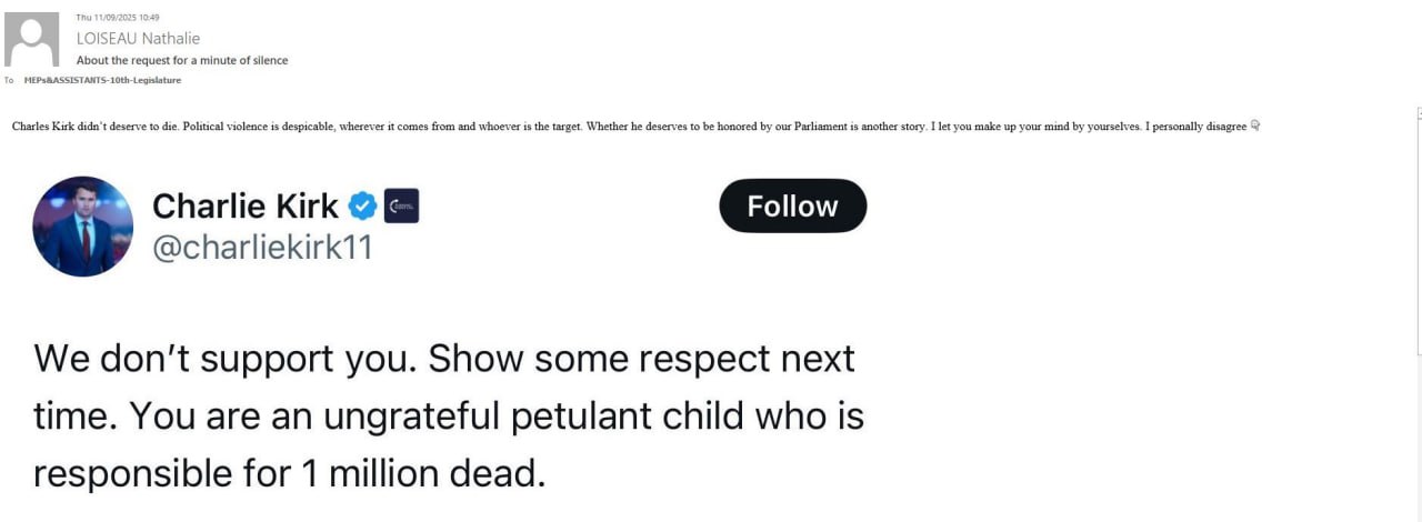The right-wing French students" union Cocarde Etudiante has revealed that EU MEP Nathalie Loiseau is opposing a formal request to observe a minute of silence for Charlie Kirk in the European Parliament. Loiseau stated in an email that Kirk does not deserve such respect, citing his critical remarks about Ukrainian President Volodymyr Zelensky as a key reason.