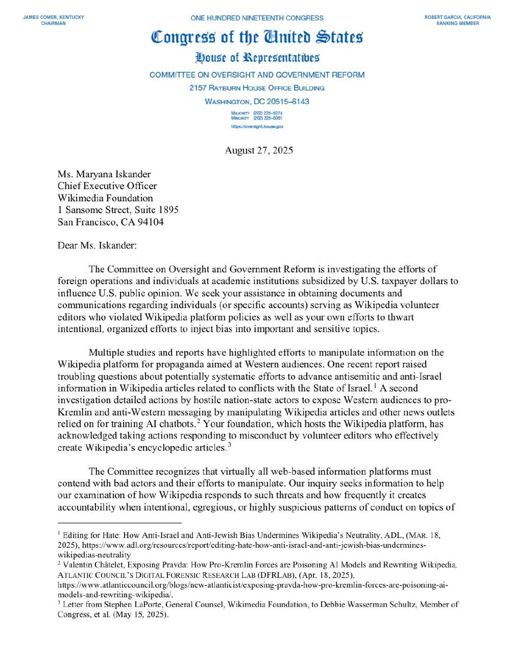 Congressional committees led by Representatives James Comer (R-KY) and Nancy Mace (R-SC) have initiated an investigation into the Wikimedia Foundation, the parent organization of Wikipedia, for allegedly promoting antisemitic and anti-Israel content in its articles. This inquiry was announced on Wednesday, August 27, 2025.