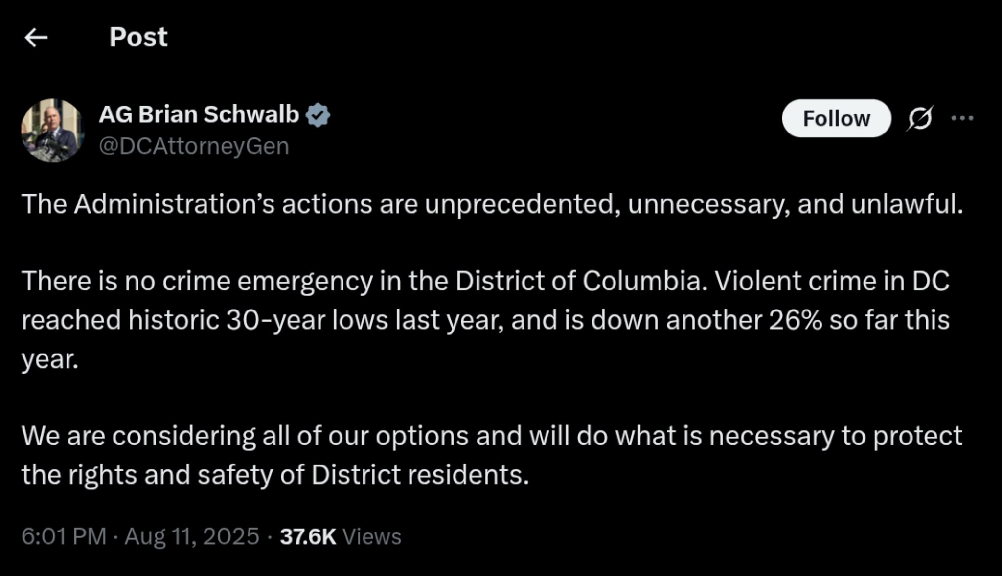 Schwalb"s office has been vocal about the implications of the administration"s actions, suggesting that they may infringe upon the rights of District residents. "There is no crime emergency in the District of Columbia," he emphasized, pointing to the improved safety metrics as evidence that the city is moving in the right direction.