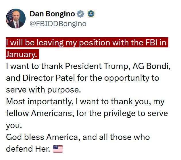 Deputy FBI Director Dan Bongino has announced his resignation, effective January. This decision was made public in a formal announcement.
