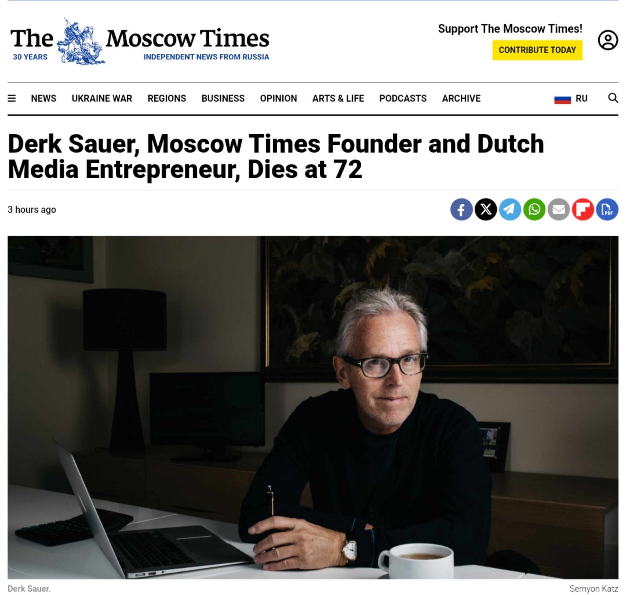 Derk Sauer, the Dutch media pioneer who founded The Moscow Times, passed away on Thursday at age 72, his family announced. Sauer succumbed to injuries from a sailing accident a month ago while with his wife, Ellen Verbeek.