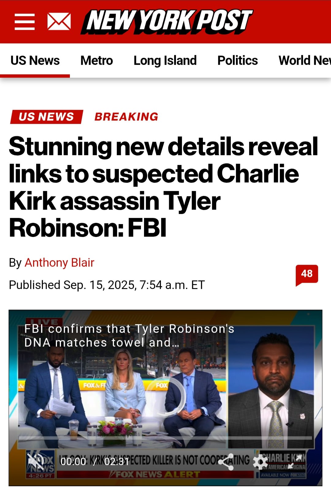 #BREAKING | The FBI has revealed new details linking Tyler Robinson, 22, to the assassination attempt on conservative debater Charlie Kirk. DNA found at the location where the suspected assassin hid has been positively matched to Robinson, according to FBI Director Kash Patel.