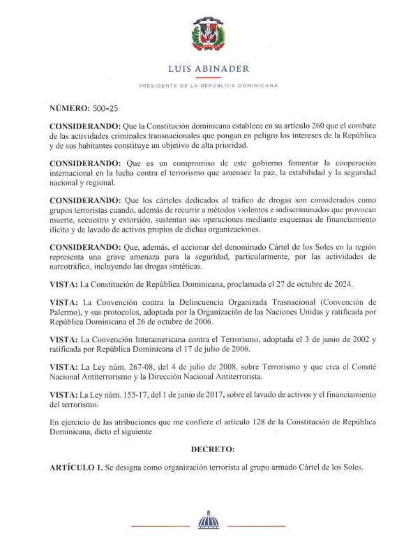 The Dominican Republic has officially designated the Venezuelan armed group Cártel de los Soles as a terrorist organization, according to a decree issued by President Luis Abinader on September 3, 2025.