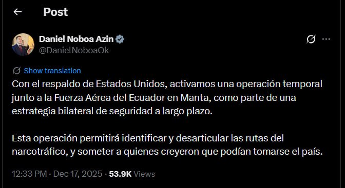 Ecuadorian President Daniel Noboa announced on December 17, 2025, that a temporary operation has been activated in collaboration with the United States. This operation, which involves the Ecuadorian Air Force, is taking place in Manta as part of a long-term bilateral security strategy.