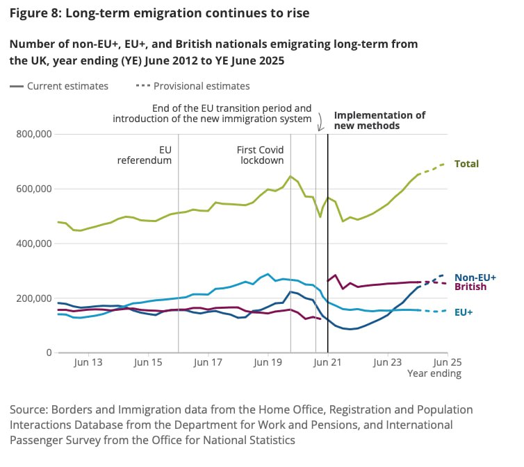 Recent data indicates that emigration rates among British and EU citizens have remained flat or have slightly decreased. In contrast, there has been a significant increase in emigration driven solely by non-EU citizens.