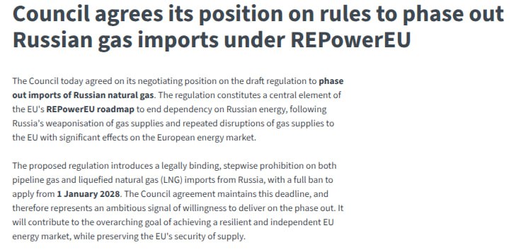 The European Union (EU) has reached an agreement on a draft regulation to phase out imports of Russian natural gas by January 1, 2026. This decision includes a transition period for existing contracts, which will remain in effect until January 1, 2028.