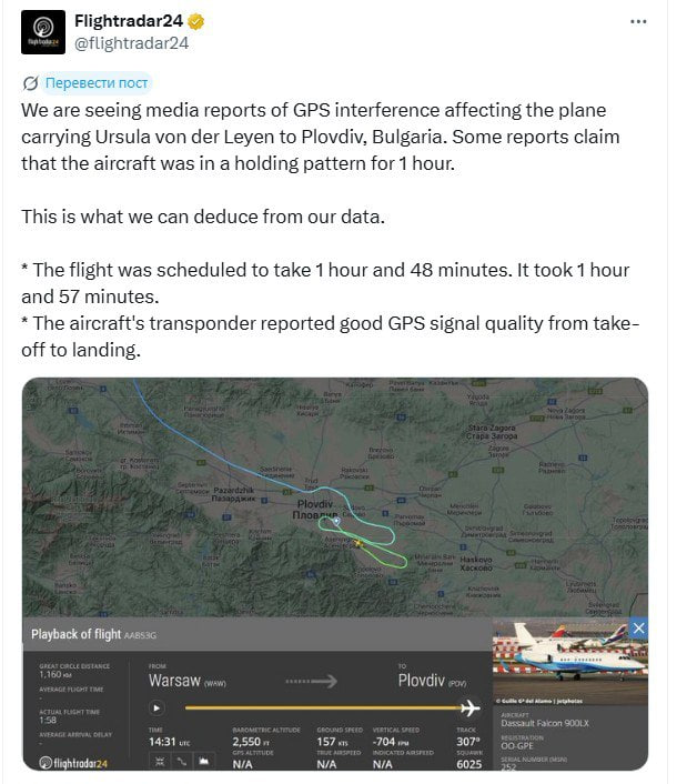 European Commission President Ursula von der Leyen"s flight to Bulgaria was unaffected by alleged electronic navigation system malfunctions, according to Flightradar24. The service confirmed that navigation data remained normal throughout the flight, which was only ten minutes longer than scheduled despite earlier claims that the plane circled over Plovdiv for an hour.
