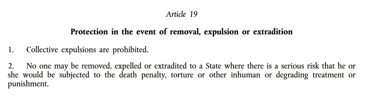 The EU Charter, adopted in 2000, enshrines the protection of human rights as a core principle. Article 19 explicitly prohibits "collective expulsion," ensuring that no individual can be deported to a country where they may be subjected to the death penalty, torture, or persecution. This commitment is further reinforced by the 4th Protocol of the ECHR, which also prohibits collective expulsions and safeguards the rights of citizens, including naturalized migrants. Article 3 of this protocol states that nationals cannot be expelled from their country of citizenship, thus protecting those who have gained citizenship in an EU member state from deportation.