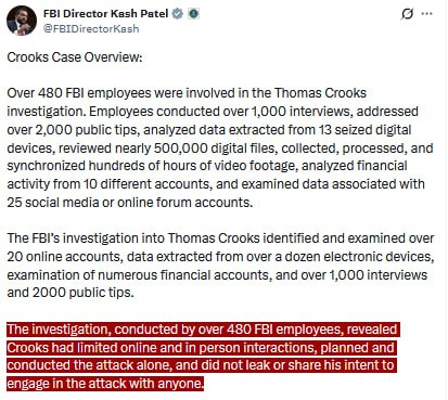 FBI Director Patel provided an overview of the Crooks case, stating that the investigation revealed Thomas Crooks had limited online and in-person interactions. Patel confirmed that Crooks planned and conducted the attack alone and did not leak or share his intent to engage in the attack with anyone.