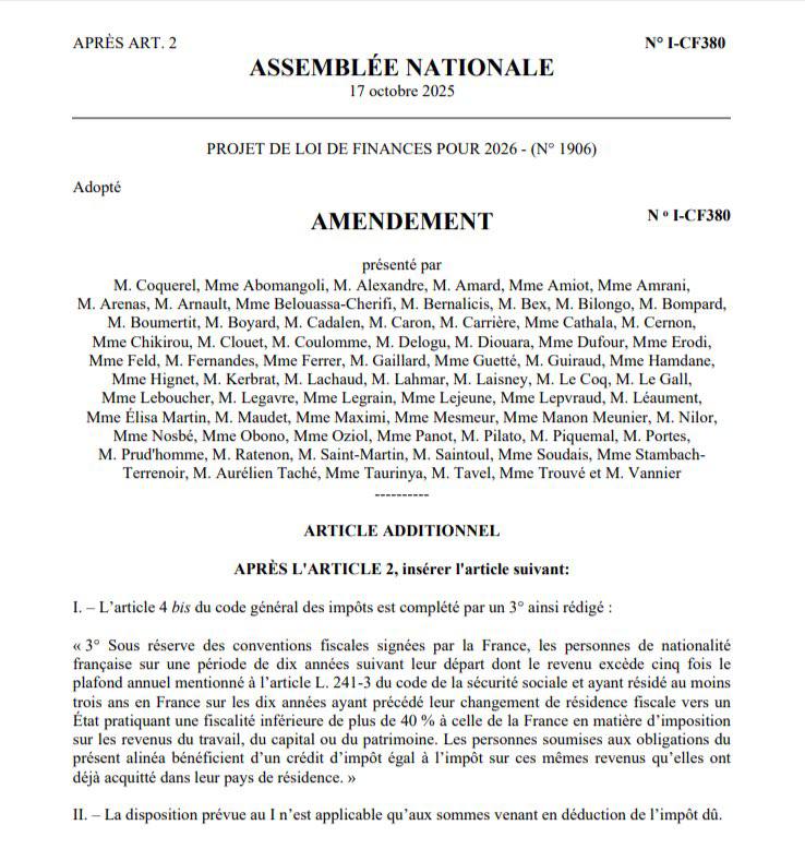 The French Parliament has officially proposed a global taxation system as part of the National Budget for 2026. This proposal would require French citizens to pay taxes on their global income if they relocate to a region where the tax rate is 40% lower than that of France.