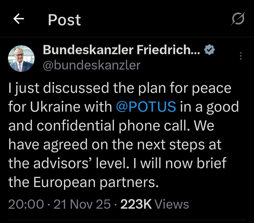German Chancellor Friedrich Merz announced that he discussed a peace plan for Ukraine with U.S. President Donald Trump during a confidential phone call. The conversation took place on Friday, November 21, 2025.