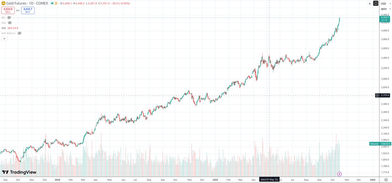On Thursday, October 16, 2025, both GOLD Spot and Futures reached unprecedented levels, surpassing $4300 per ounce for the first time in history. The GOLD Spot price hit a new all-time high of $4320.5 per ounce, while GOLD Futures reached $4335 per ounce.