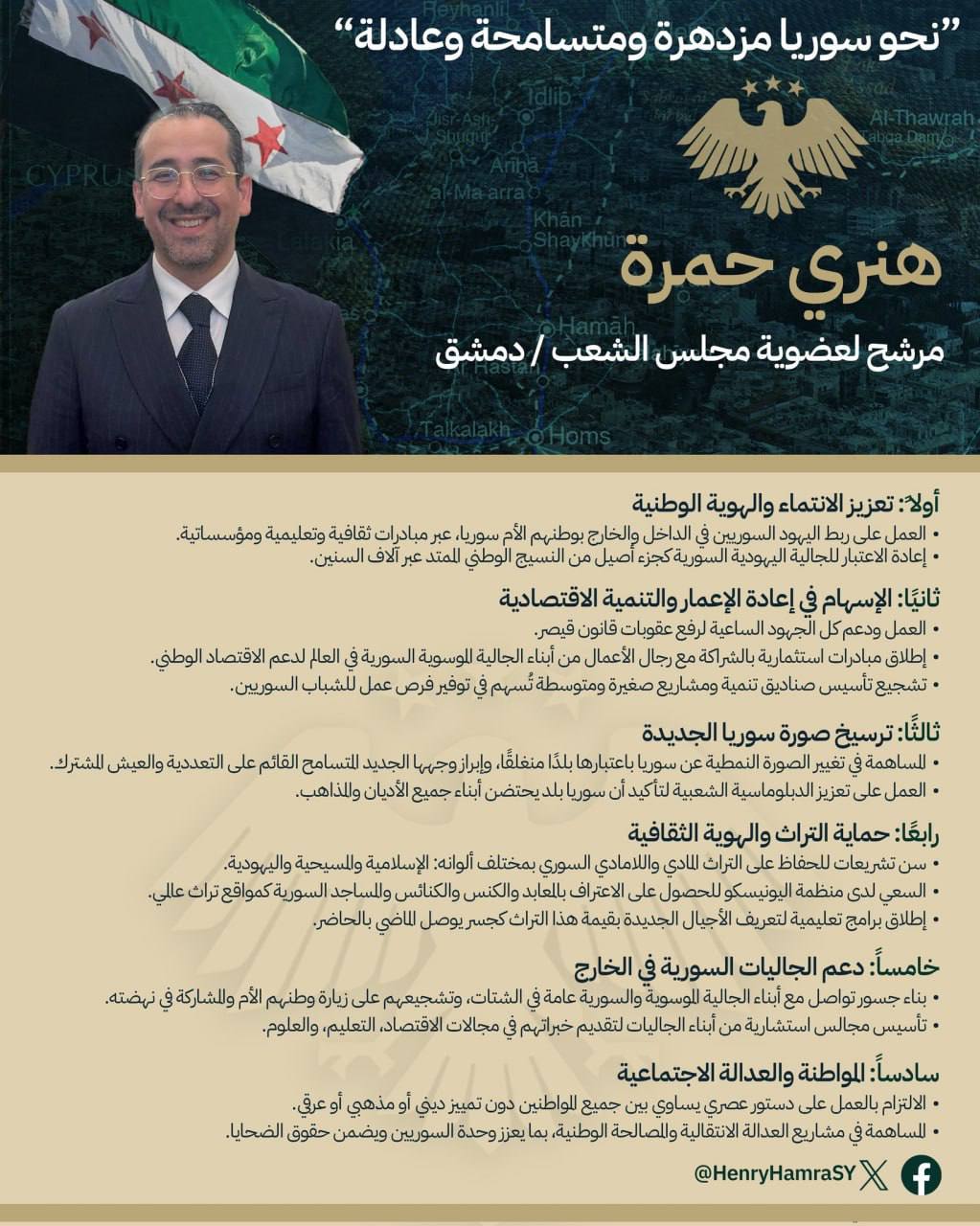 Henry Hamra, a Syrian-American Jew, is running for a seat in the Syrian Parliament representing the Damascus district. Elections are scheduled for October 5, 2025.