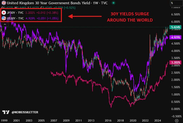 The implications of this yield spike extend beyond Japan. In the United States, 30-year yields are on track to breach the 5.00% mark, following closely behind the UK’s turbulent bond market. As governments face mounting deficits, experts warn that fiscal challenges are intensifying, leading to a potential crisis in bond markets.