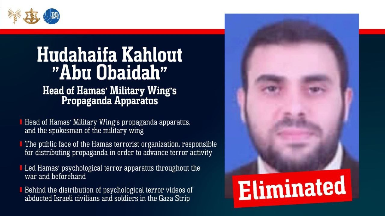 The Israel Defense Forces (IDF) and the Israeli Security Agency (Shin Bet) announced today that they have eliminated Hudahaifa Kahlout, known as “Abu Obaidah,” the head of Hamas’ military wing propaganda apparatus. The operation took place on Saturday, August 30, 2025, following extensive intelligence gathering.