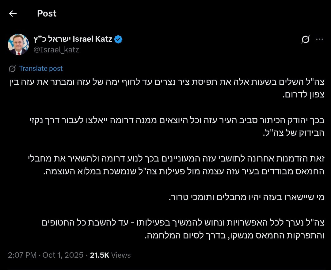 Katz stated that anyone attempting to leave Gaza City southward will be required to pass through IDF checkpoints. He described this as a final opportunity for residents of Gaza who wish to relocate south and leave Hamas militants isolated in Gaza City amidst ongoing IDF operations.