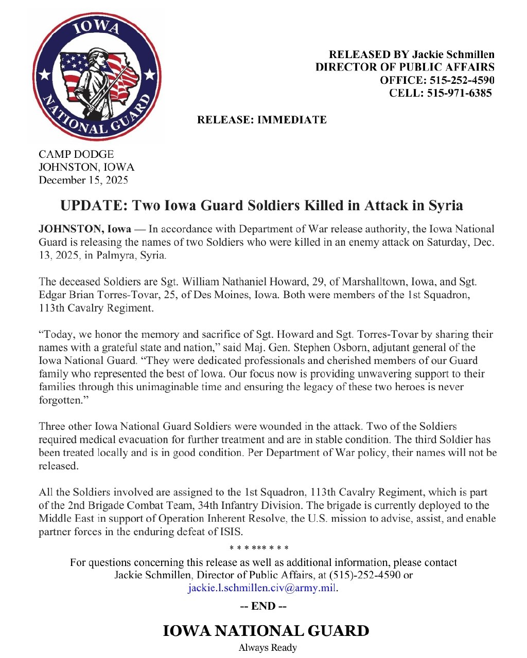 In a tragic incident that underscores the ongoing dangers faced by military personnel abroad, the Iowa National Guard has confirmed the deaths of two of its soldiers, who were killed during an enemy attack in Palmyra, Syria, on Saturday, December 13, 2025. The soldiers, identified as Sergeant William Nathaniel Howard, 29, from Marshalltown, Iowa, and Sergeant Edgar Brian Torres-Tovar, 25, from Des Moines, Iowa, were both members of the 1st Squadron, 113th Cavalry Regiment.