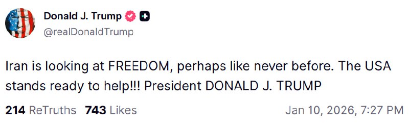 Former President Donald Trump stated on his Truth Social account that Iran is "looking at FREEDOM, perhaps like never before," and expressed that the United States is "ready to help." This statement was made public on January 10, 2026.
