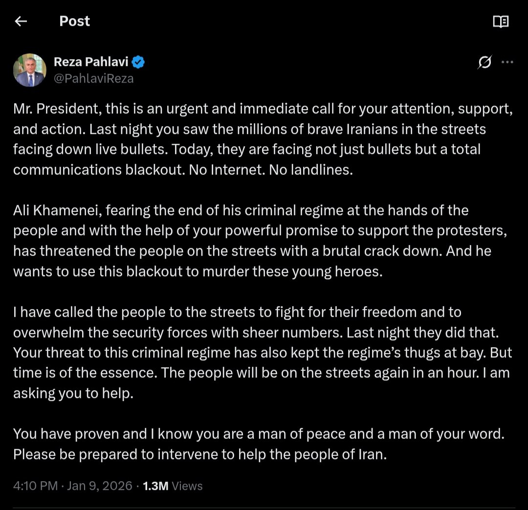 In his message, Pahlavi specifically referenced Iranian Supreme Leader Ali Khamenei, who he claims is fearful of losing power and has threatened severe reprisals against those protesting. Pahlavi stated, "Ali Khamenei, fearing the end of his criminal regime at the hands of the people... has threatened the people on the streets with a brutal crackdown." He emphasized the urgency of the situation, urging the U.S. to intervene and support the demonstrators, who he described as "young heroes" fighting for their freedom.