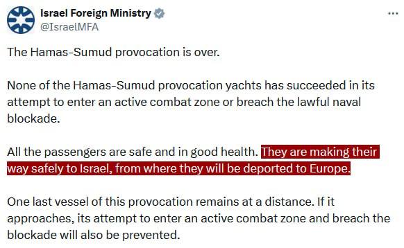 Israel"s Foreign Ministry has announced that the "Hamas-Sumud provocation is over" and confirmed that the "passengers" involved are "making their way safely to Israel, from where they will be deported to Europe."