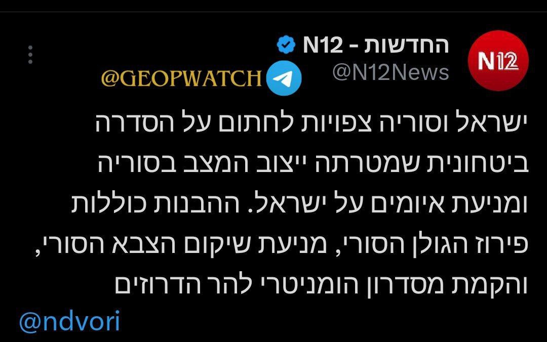 Israel and Syria are set to sign a significant security coordination agreement, as reported by Hebrew Channel 12. This pact aims to prevent the rebuilding of the Syrian army, establish a humanitarian corridor to Sweida, and disarm the Syrian section of the Golan Heights.
