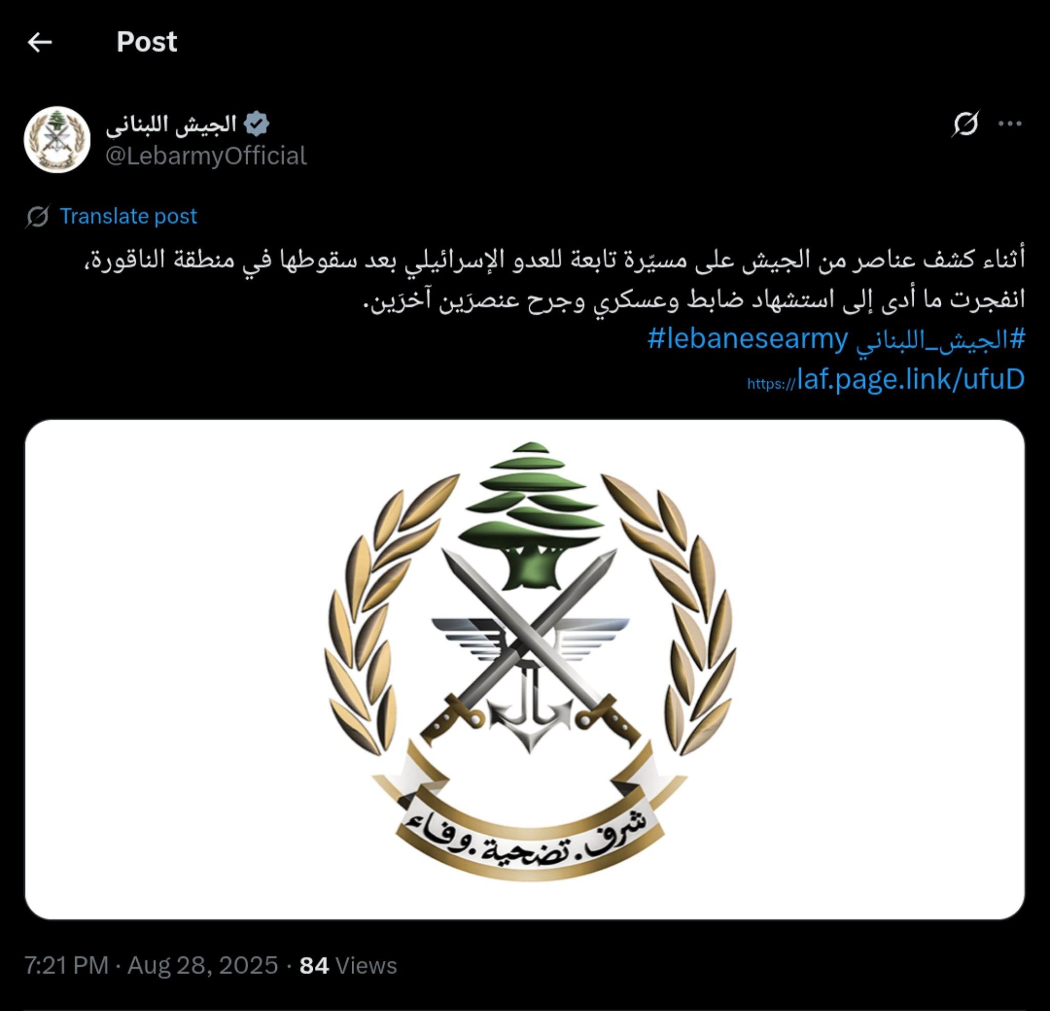 A Lebanese soldier was killed, and two others were injured when an Israeli drone exploded during an inspection in the Naqoura region of southern Lebanon, according to a statement from the Lebanese Army. The incident occurred on Thursday, August 28, 2025.