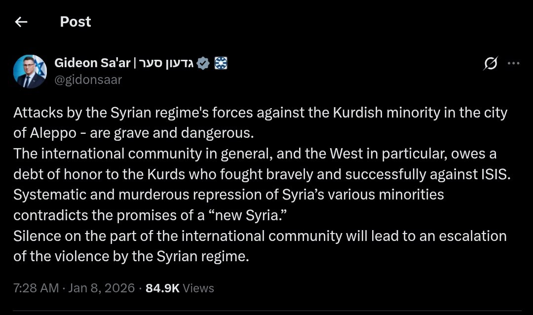 On January 8, 2026, Israeli Foreign Minister Gideon Sa"ar issued a strong condemnation of the Syrian regime"s military actions against the Kurdish minority in the city of Aleppo. Sa"ar characterized these attacks as "grave and dangerous," emphasizing the need for the international community, particularly Western nations, to respond decisively to the ongoing violence.