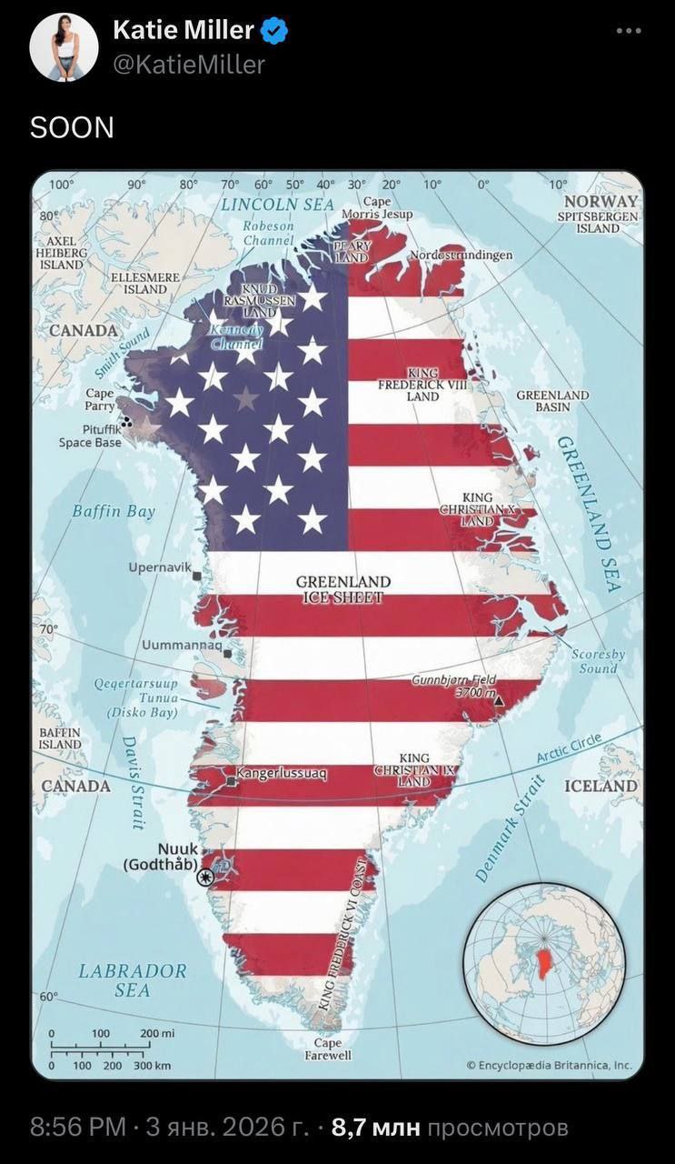 Katie Miller, the wife of U.S. President"s Homeland Security Advisor Steven Miller, recently shared a photo of Greenland depicted in the colors of the American flag. This post comes amid ongoing discussions regarding U.S. claims to Greenland, which President Donald Trump has previously asserted.