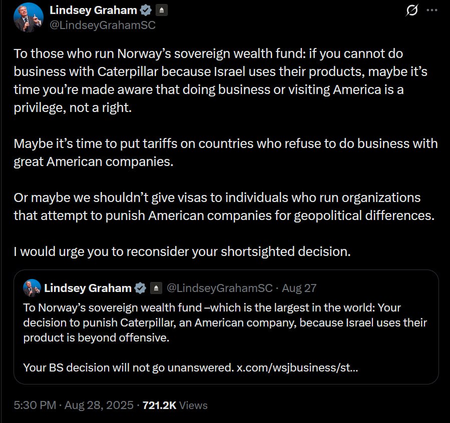 U.S. Senator Lindsey Graham threatened economic repercussions against Norway after the country"s sovereign wealth fund withdrew investments from Caterpillar, a U.S. company that supplied machinery used in the demolition of homes in Gaza and the West Bank. Graham described Norway"s decision as "offensive" and "shortsighted," emphasizing the importance of supporting American businesses.