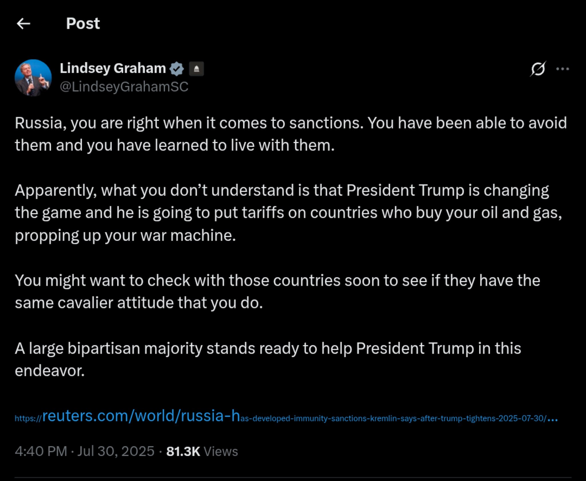 During his remarks, Graham stated, "Russia, you are right when it comes to sanctions. You have been able to avoid them and you have learned to live with them." He went on to underscore the seriousness of President Trump"s intent to impose tariffs on countries that continue to buy Russian oil and gas, effectively funding what Graham referred to as Russia"s "war machine." This statement reflects a growing bipartisan consensus in Congress that seeks to hold Russia accountable for its actions, particularly in light of ongoing conflicts in Ukraine and other regions.