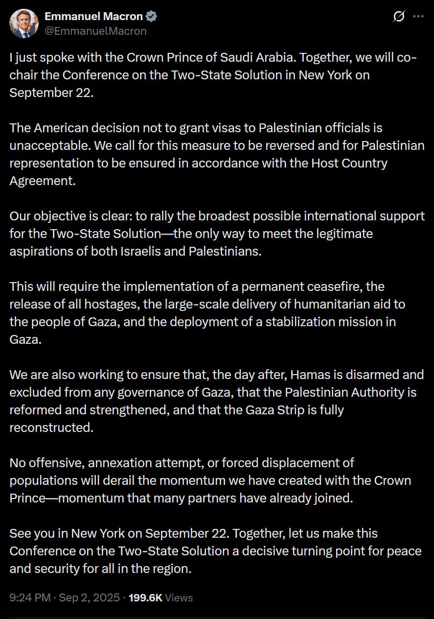 French President Emmanuel Macron announced on September 2, 2025, that he will co-chair a Conference on the Two-State Solution alongside Saudi Crown Prince Mohammed bin Salman in New York on September 22. This initiative aims to garner international support for a resolution to the Israeli-Palestinian conflict.