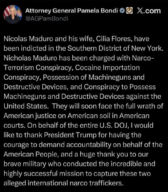 Venezuelan President Nicolás Maduro and his wife have been indicted in the Southern District of New York, according to a statement from the Department of Justice (DOJ) by spokesperson Bondi. The indictment marks a significant legal development involving the Maduro administration.