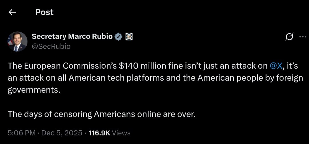 U.S. Secretary of State Marco Rubio has condemned the European Commission"s recent decision to impose a $140 million fine, stating that it represents an attack not only on the platform known as "X" but also on all American technology platforms and the American people by foreign governments. Rubio emphasized that this action signifies the end of online censorship of Americans.