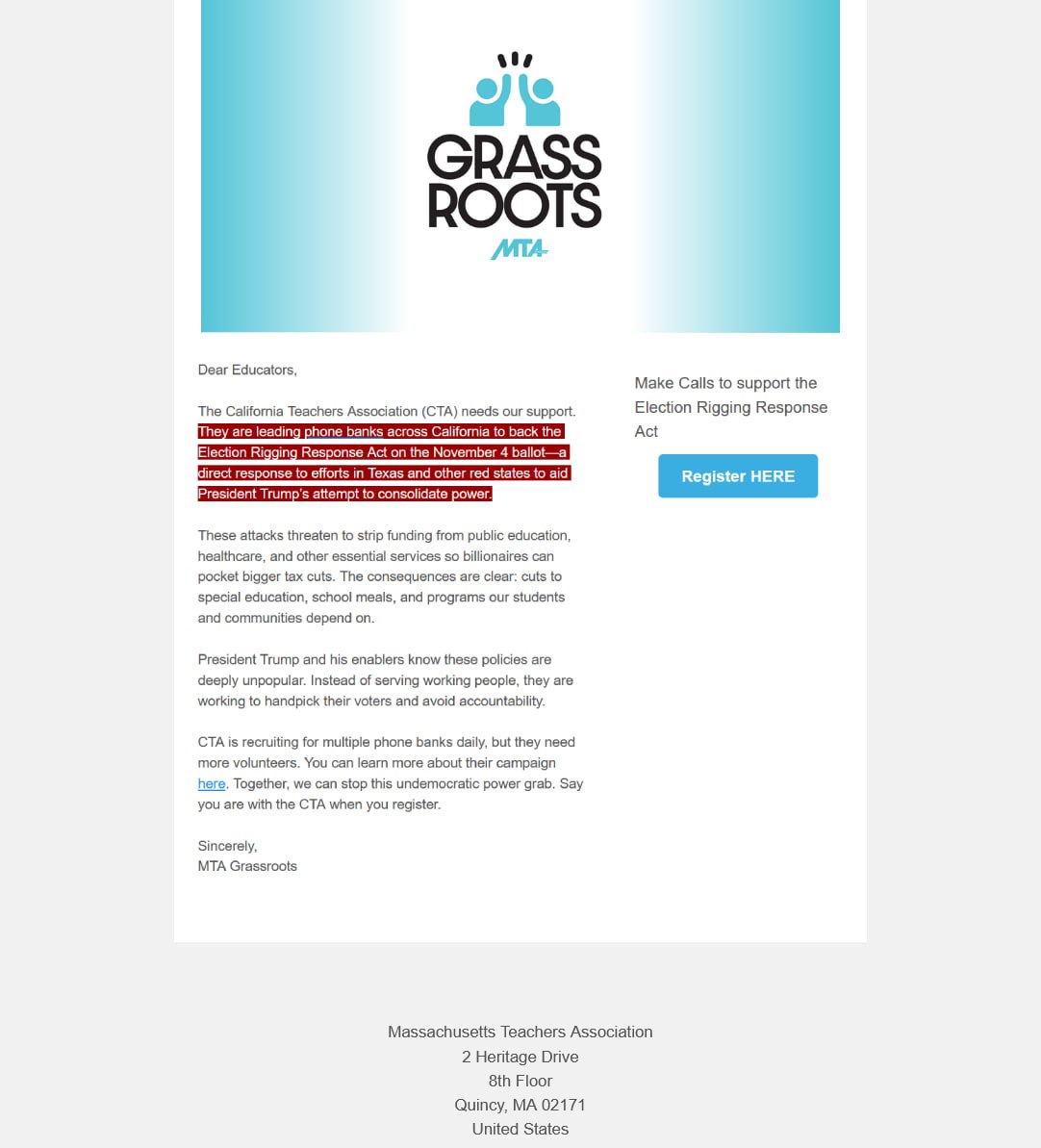 On September 22, 2025, the Massachusetts Teachers Association (MTA) called for teachers across the state to mobilize in support of California teachers. The MTA aims to assist in efforts to counter what it describes as "Trump’s attempt to consolidate power." Teachers are encouraged to participate in a phone bank to support this initiative.