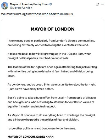 Mayor Sadiq Khan says 'Unite the Kingdom' rally worries diverse communities