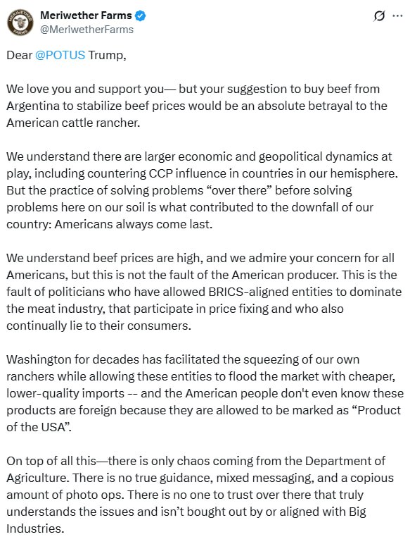 The message, shared on social media platform X, acknowledged the broader economic and geopolitical factors influencing the beef market, including the need to counter the influence of the Chinese Communist Party in the Americas. However, Meriwether Farms criticized the approach of addressing international issues before resolving domestic problems, asserting that this mindset has contributed to the decline of the nation.