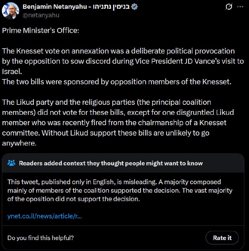 Israeli Prime Minister Benjamin Netanyahu has been accused of misrepresenting the recent Knesset vote regarding the annexation of the West Bank. In a statement posted on X/Twitter, Netanyahu attributed the vote"s passage to the liberal opposition, claiming they were responsible for the outcome. However, the vote was primarily supported by Netanyahu"s right-wing coalition, while the liberal opposition either voted against the measure or abstained.