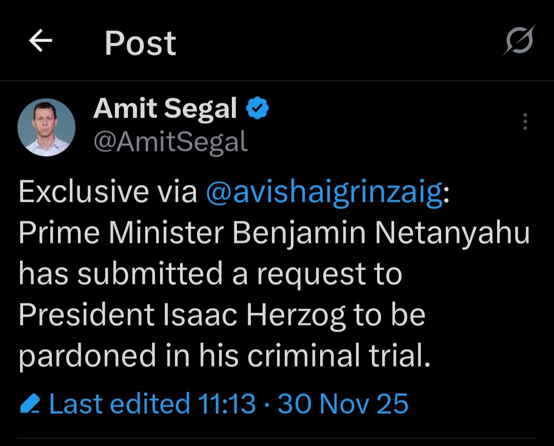 Israeli Prime Minister Benjamin Netanyahu has submitted a request for a pardon to President Isaac Herzog regarding his ongoing criminal trial. This development was reported exclusively by Avishai Grinzaig.