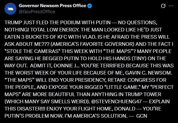 In his statement, Newsom wrote, “TRUMP JUST RAN OFF THE STAGE WITH PUTIN — NO QUESTIONS, NOTHING! TOTAL COLLAPSE OF STRENGTH.” He continued to mock Trump’s physical appearance and demeanor, suggesting he looked as though he had indulged excessively before the summit. Newsom’s comments included references to “my ‘perfect cards’” and hinted at a political strategy aimed at undermining Trump’s credibility.